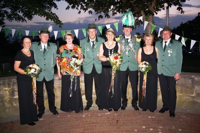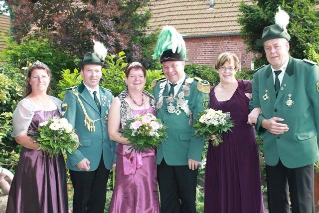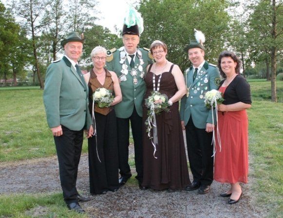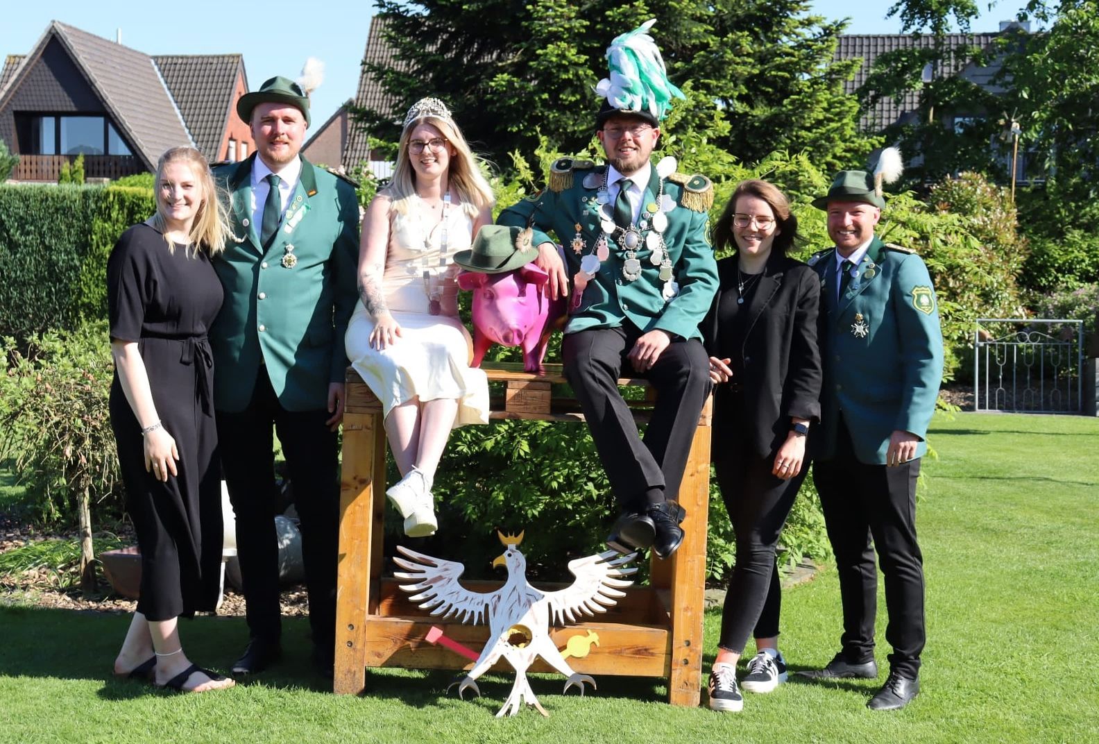 Ehrenpaar Carlo und Anne Ricke, Königspaar Christian und Petra Greve, Vizekönigspaar Jonas Kotte und Sophie Büscher und Ehrenpaar Bertram und Jana Vocks (v.l.n.r.)